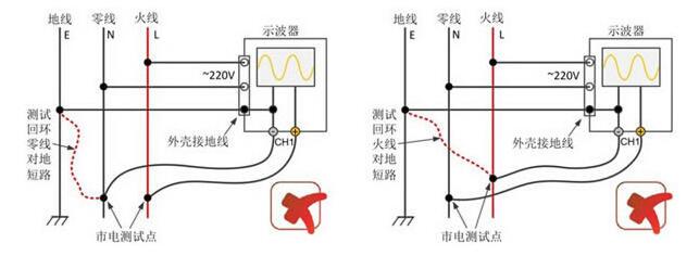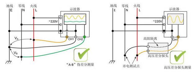 采用普通(tong)無源探頭應用“A-B”法對市電(diàn)進行測量時,應将(jiang)兩通道探頭的負(fu)端(地)均接至電源(yuan)地線,一個通道的(de)探頭探針(正端)接(jie)零線,另一個通道(dao)的探頭探針(正端(duān))接火線(如圖5左所示),則兩(liang)通道的測量差值(zhi)即爲市電波形。