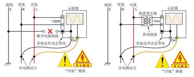 如圖3所示,通過(guò)将示波器的電源(yuan)地線人爲斷開(可(ke)以用兩芯電源插(chā)排供電)或使用隔(gé)離變壓器的方法(fa)對示波器供電,達(da)到斷開測量回環(huan)的目的,實現“浮地(dì)”測量。