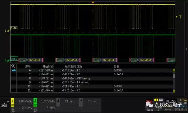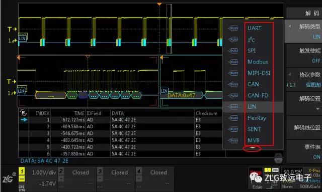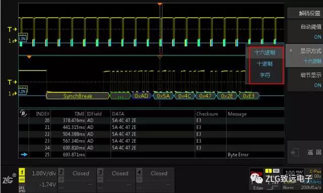 ZDS4000系列示(shi)波器免費(fei)标配以上(shàng)30餘種協議(yì)解碼,支持(chí)解碼以“十(shi)✍️進制”,“十六(liu)進制”,“字符(fú)”三種方式(shi)顯示,如圖(tú)9、10所示。