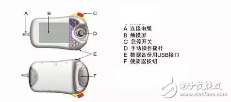上圖是 ABB機器人示(shì)教器,其中A是示教(jiao)器與控制櫃之間(jiān)的連接電纜,B是觸(chù)摸屏,C是急停開關(guān),D是手動操縱杆,E是(shì)數據備份與恢複(fú)用 接(jie)口(可插U盤/移動硬(yìng)盤等存儲設備),F是(shi)使能按鈕。
