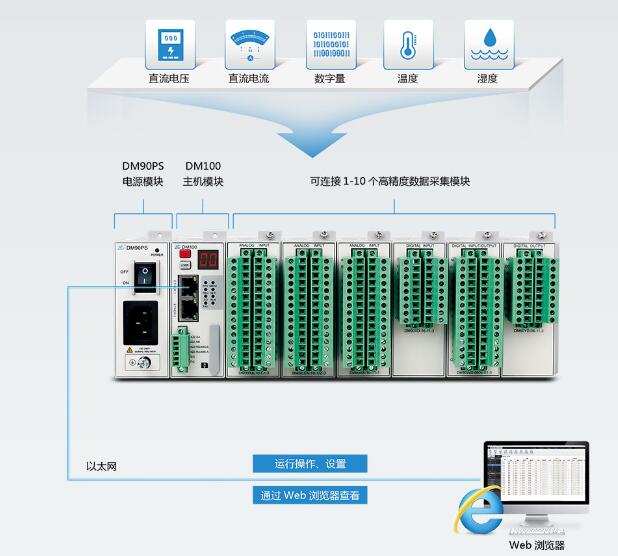 DM100數據(ju)采集記錄(lu)儀主機自(zi)帶Web 服務器(qi),通過以太(tài)網接口連(lián)接電腦,用(yong)戶進入浏(liú)覽器訪問(wèn)DM100主機IP地址(zhǐ)即可實時(shí)監測測量(liang)數據與更(geng)改設置,無(wú)需下載安(an)裝上位機(jī)軟件,易用(yòng)性強。