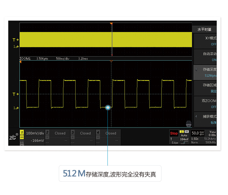 存儲深度(du)等于采樣(yang)率乘以采(cǎi)樣時間,512M超(chao)大存儲深(shen)度,長🈲時間(jian)捕獲波形(xing),依然不會(hui)出現波形(xing)失真。