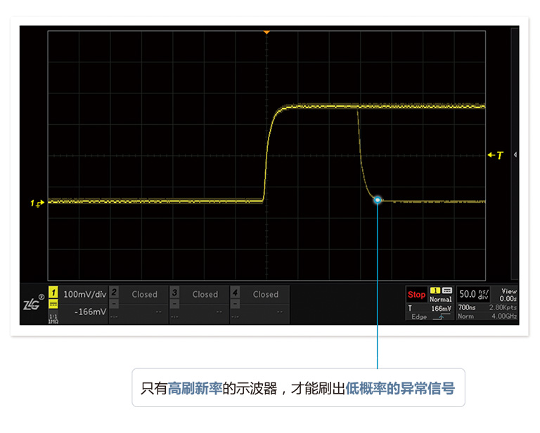 ZDS4000系列(lie)示波器不(bu)隻提供了(le)512M的波形大(da)數據,還配(pèi)有強大的(de)波形搜索(suo)功能和智(zhì)能标注功(gōng)能。您可以(yi)先通過邊(bian)沿、脈寬、欠(qiàn)幅、上升/下(xia)降時間、周(zhōu)期/頻率等(deng)多種搜索(suǒ)條件來定(ding)位512Mpts波形數(shu)據中的異(yì)常點,再對(duì)找出的異(yì)常信号使(shi)用标注功(gong)能,對異常(chang)信号進行(hang)标注。這裏(lǐ),所有的測(ce)量都是經(jīng)過FPGA全硬件(jiàn)加速,整個(gè)過程1S左右(yòu)即可完成(chéng)。再對找出(chū)的異常信(xìn)号使用标(biāo)注功能,對(dui)異常信号(hao)進行标注(zhu)。