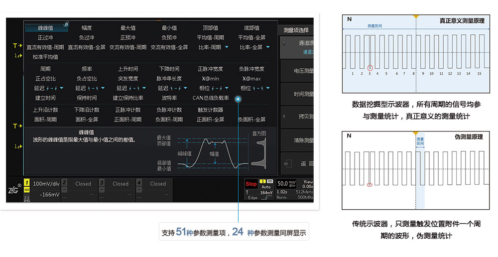 不(bú)同于傳統(tǒng)示波器隻(zhī)測一個周(zhou)期,或通過(guò)抽樣減少(shao)數據量再(zai)☔測量的模(mó)式,ZDS4000系列示(shì)波器通過(guo)FPGA全硬件并(bìng)行處理,基(ji)于原始采(cǎi)樣率和512Mpts全(quán)存儲深度(dù),對每一幀(zhēn)波形每一(yī)周期進行(hang)測量統計(jì),僅需約1秒(miǎo)即可實🤞現(xiàn)對512Mpts數據💞的(de)“真正意義(yi)”參數測㊙️量(liang),測試項目(mu)可達51種,并(bìng)且支持24種(zhǒng)❤️參數同時(shi)顯示。這與(yu)傳統意義(yì)示波器的(de)測量有着(zhe)本質的區(qū)别,也是🔅示(shi)波器測試(shì)手段與🛀🏻測(cè)試方法的(de)重大突破(po)。