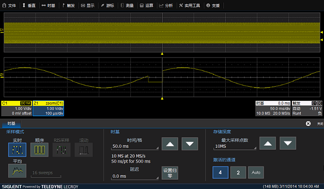 | 時基範(fàn)圍 | 實時采(cai)樣:500ps/div ~ 50s/div;等效(xiao)采樣:500ps/div ~ 10ns/div;滾(gun)動模式(shì):100ms/div ~ 50s/div | |||||